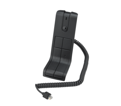 Black desktop microphone makes transmissions easy when the mobile radio is being used from a desktop because the microphone and push-to-talk button are larger. Microphone can help expedite transmissions because the user doesn't have to keep picking up the mobile microphone.