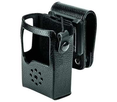This leather carrying case protects EVX-S24 radio and allows the user to secure the radio to his belt. The swivel belt loop allows the radio to easily move with the user from sitting to standing to bending.