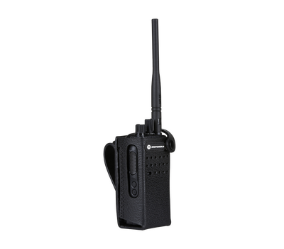 Carrying cases are available in sizes designed to fit your radio and battery and permit audio to be heard clearly. This hard leather case with 3-inch fixed belt loop is designed for the XPR 3300 non-display radio. Belt loop and nylon cases feature "D" rings that allow the cases to be attached to a carrying strap.