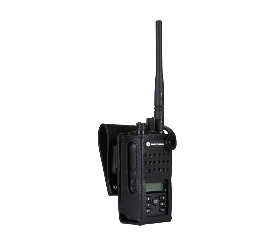 Carrying cases are available in sizes designed to fit your radio and battery and permit audio to be heard clearly. This hard leather carrying case with 3-inch swivel belt loop is designed for use with the XPR 3500 display radios. Swivel model cases secure to a belt loop and allow the case to swing freely from side to side. The swivel latch system also allows the radio and case to be removed from the belt loop by simply inverting the case and lifting it up and out of the belt loop.