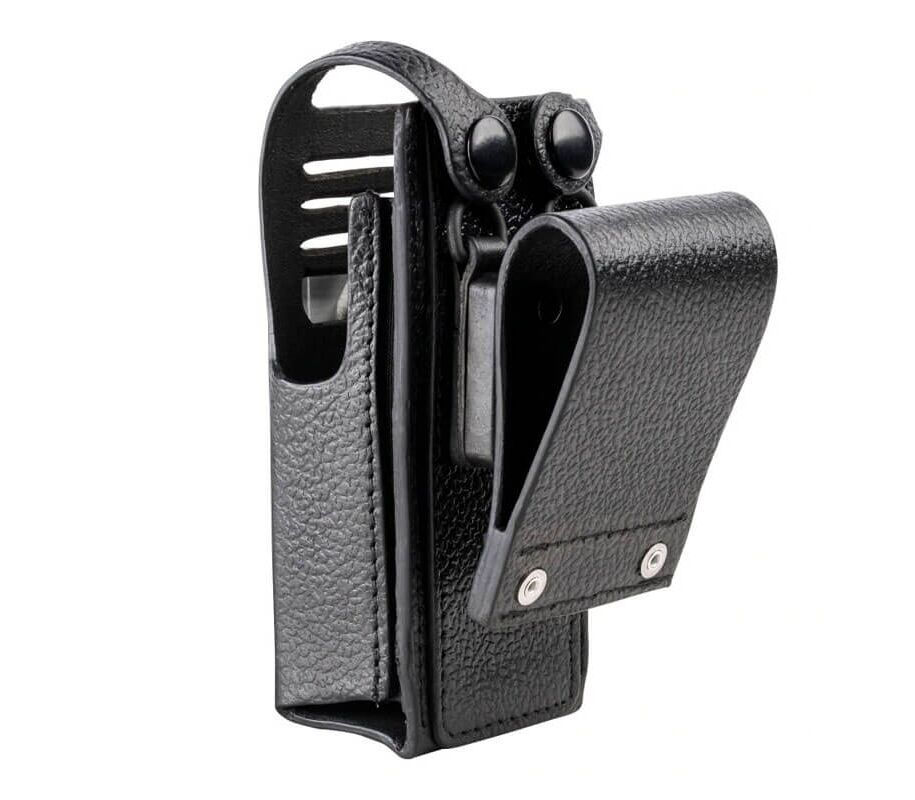 Carrying cases are available in sizes designed to fit your radio and battery and permit audio to be heard clearly. This hard leather case with 2.5-inch swivel belt loop is designed to work with the XPR 6000 series of non-display radios. Swivel model cases secure to a belt loop and allow the case to swing freely from side to side. The swivel latch system also allows the radio and case to be removed from the belt loop by simply inverting the case and lifting it up and out of the belt loop.