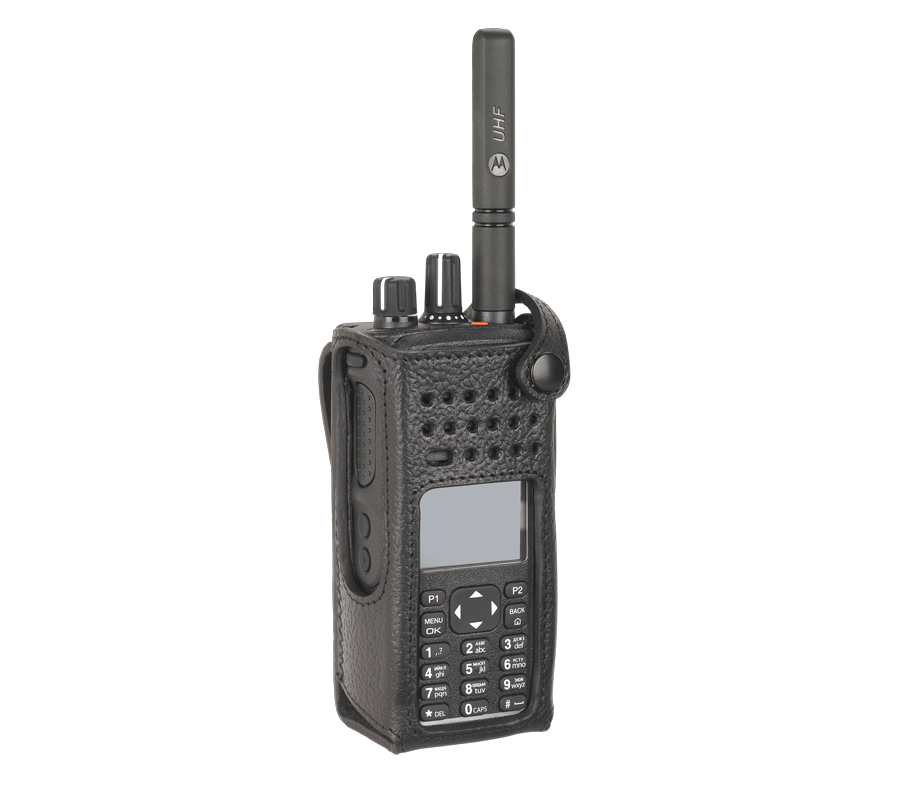 Carrying cases are available in sizes designed to fit your radio and battery and permit audio to be heard clearly. This hard leather case with 3-inch fixed belt loop is designed to work with the XPR 7550 display radio. Belt loop and nylon cases feature "D" rings that allow the cases to be attached to a carrying strap.