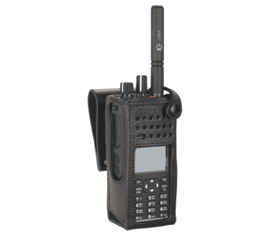 Carrying cases are available in sizes designed to fit your radio and battery and permit audio to be heard clearly. This hard leather case with 3-inch swivel belt loop is designed to work with the XPR 7550 and XPR 7580 display radio. Swivel model cases secure to a belt loop and allow the case to swing freely from side to side. The swivel latch system also allows the radio and case to be removed from the belt loop by simply inverting the case and lifting it up and out of the belt loop.