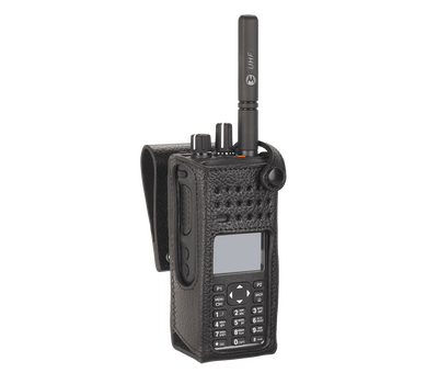 Carrying cases are available in sizes designed to fit your radio and battery and permit audio to be heard clearly. This hard leather case with 2.5-inch swivel belt loop is designed to work with the XPR 7550 and XPR 7580 display radio. Swivel model cases secure to a belt loop and allow the case to swing freely from side to side. The swivel latch system also allows the radio and case to be removed from the belt loop by simply inverting the case and lifting it up and out of the belt loop.